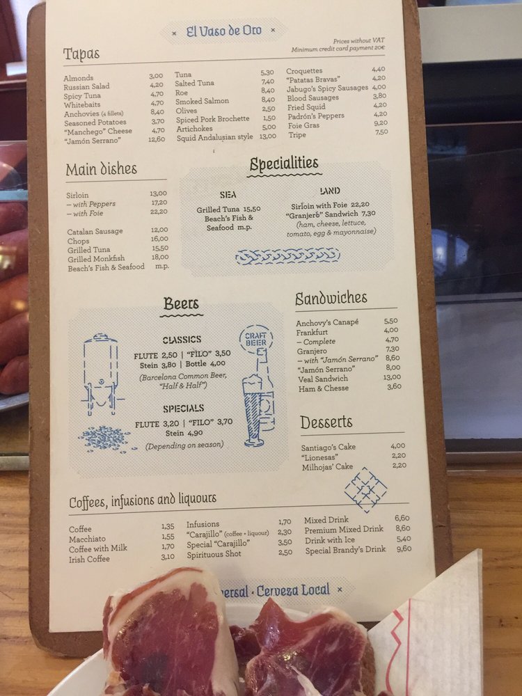 Introducing the menu at El Vaso de Oro, a tapas bar in Barcelona known for its authentic Spanish cuisine and homemade beer. Located on Carrer de Balboa, this bustling establishment offers a variety of tapas that have left customers raving. From the beef sirloin with foie gras to the patatas bravas and calamari, each dish is a flavorful delight. Customers have praised the friendly service, cozy ambiance, and the selection of tapas that never disappoint. The croquettes and sirloin with foie are must-try items that will leave your taste buds craving more. Don't forget to wash it all down with their homemade beer for a complete dining experience. El Vaso de Oro is a gem in Barcelona's culinary scene that should not be missed.